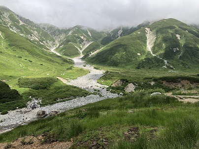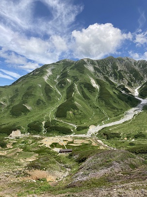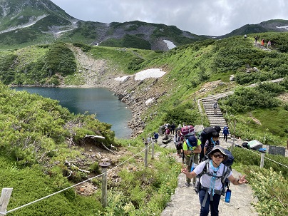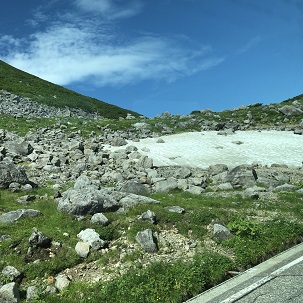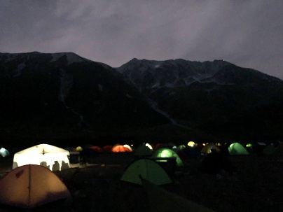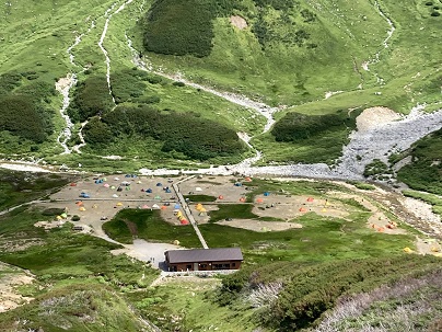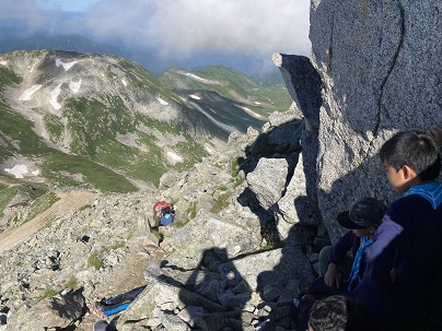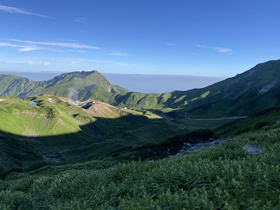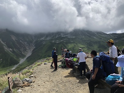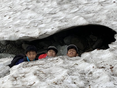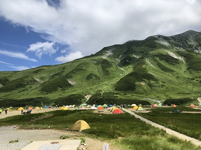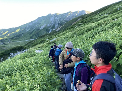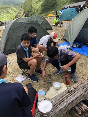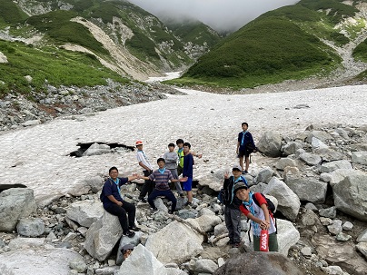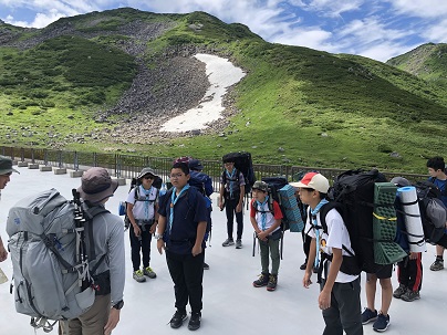 立山連峰へ出発です! 【8月3日:三日目】 立山へは車での入山ができません。 早朝、富山駅から出発する登山バスを使って 室堂へ向かいます。 まだ眠そうですね。 平地の気温は35℃越えの酷暑でも、 標高が上がると残雪がありました。 室堂ターミナル到着! いいお天気でなによりです。 ここからは、各自キャンプ装備を持ち、 歩いて雷鳥沢キャンプ場へ向かいます。 道は整備されているとはいえ、 個人テントなどの装備を持って歩くのは なかなか大変です。 途中休憩。 だいぶ登ってきました。 室堂ターミナルが遠くに見えます。 約一時間かけて、雷鳥沢キャンプ場につきました。 標高約2400m、 ここで一泊して高地に身体を慣らします。 休憩後、各自個人テントを建て、 前回のキャンプで作ったアルコールバーナーを使って 昼食をとります。 午後は班活動です。 雷鳥沢キャンプ周辺を散策しました。 絶景です。 こちらにも残雪がまだまだありました。 昨日は海ではしゃいでいたスカウトもいたのに、 今日は雪にまみれます。 散策を終え、キャンプ場に戻ってからは 夕食を取り、身体を休めます。 日が落ちてからは、 それぞれのテントがホタルのように光りますね。 明日はいよいよ雄山へ登りますよ~! | 次のページ>> | カテゴリー