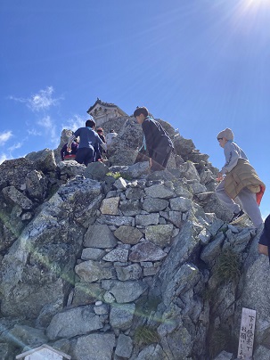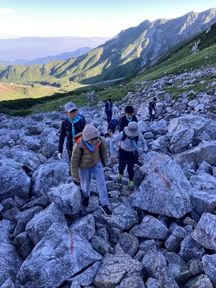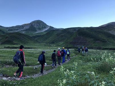 夜が明けました。 天候は問題なさそうです! いよいよ、雄山への登頂開始します。 最初はなだらかな道ですが、 少しずつ岩が増えていきます。 途中、高山植物に囲まれた道になりました。 こちらは「コバイケイソウ」 標高2400m以上で見られる高山植物です。 花は一斉に咲く年とあまり咲かない年があるそうですが、 今年は当たり年かな? 太陽が高く上がってきました。 道も険しくなってきましたね。 標高2700m、一の越山荘で小休止。 気温は12度です。 ※富山市の気温は、最高気温37度、最低気温28度でした。 登山の無事を祈願 立山連峰は活火山です。 遠くに活動の証が見えました。 さて、ここからは更に道が険しくなっていきます。 あと少し!頑張れ! 山頂に到着しました!! 雄山の岩頭に鎮座する「雄山神社」へお参りします。 登頂おめでとう! 天候にも恵まれ、 充実した活動となりました。 午後は呉羽少年自然の家まで戻り、 明日は班活動を行います。 さて、今年度夏期長期野営のメイン、
