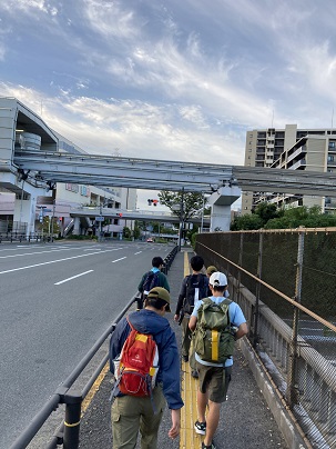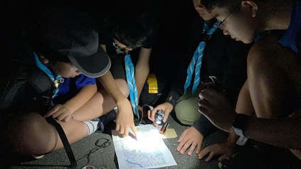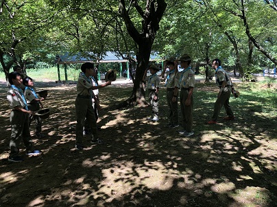 班長・次長会議にて 「ナイトハイク」に決定しました。 夜集合し、夜通しで吹田市・箕面市周辺を歩きます。 今回のハイクは、指導者からのヒントをたよりに目的地を割り出し、 向かわなければなりません。 渡された指示書には座標が示されています。 解読するスカウトたち。 解読に苦戦する班も^^; 解読できた班から出発! 隊付きのベンチャースカウトも同行しました。 第一チェックポイント到着 第二の指示書が指導者より渡されます。 解読中・・・・・・ 目的地は、 箕面大滝でした。 夜もだいぶ深い時間となり、 スカウトを眠気と寒さが襲います。 班ごとに到着時間が異なりましたが、 箕面大滝に全員そろってから、帰路につきます。 休憩中、気を抜くと一瞬で眠りに落ちてしまいます。 空が明るくなってきました。 明け方、眠気も疲れもピークですが、 歩みは止めません。 無事、全員完歩しました。 ベンチャー隊以上になると、 100キロを24時間かけて歩く 「100キロハイク」にも参加できるようになります。 いい予行演習になったかな 【8月5日:五日目】