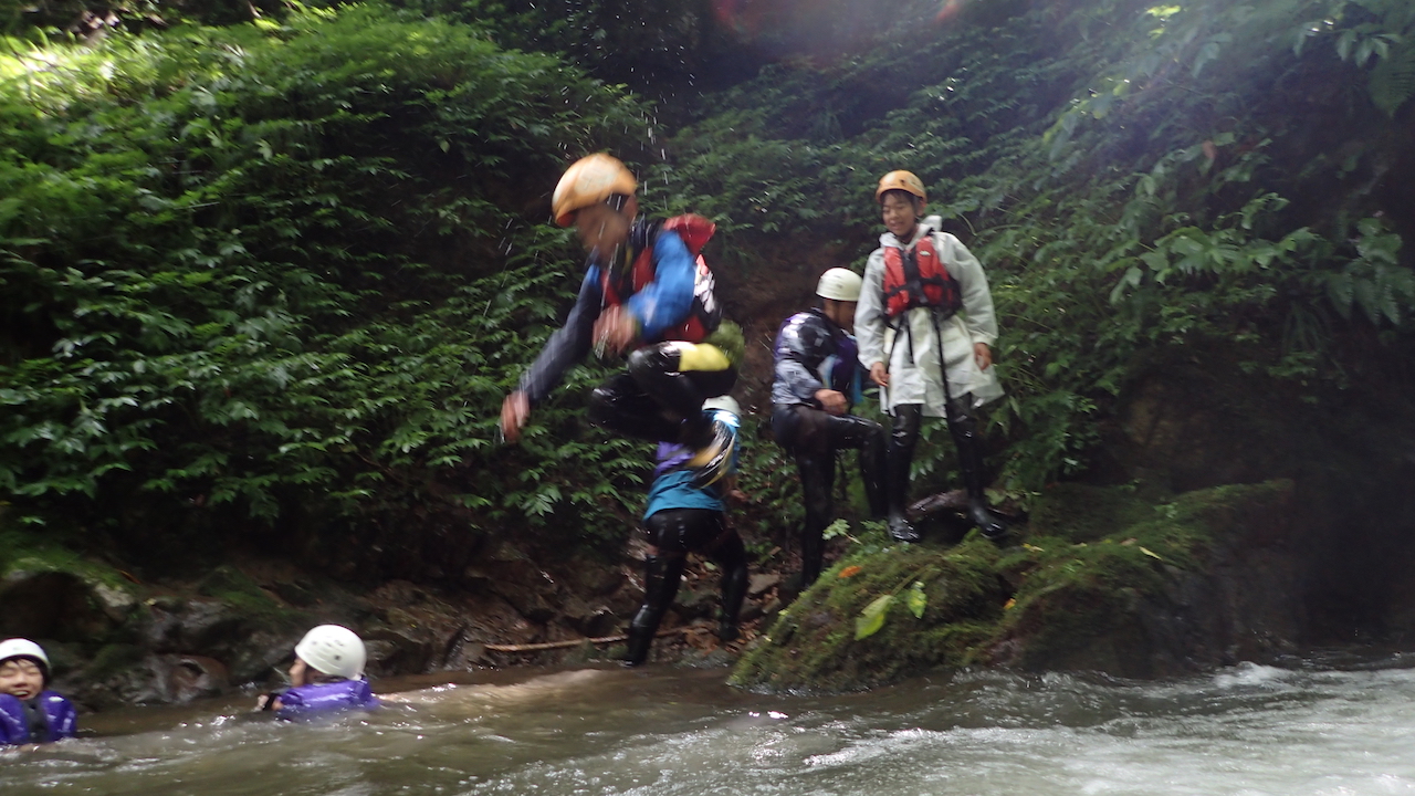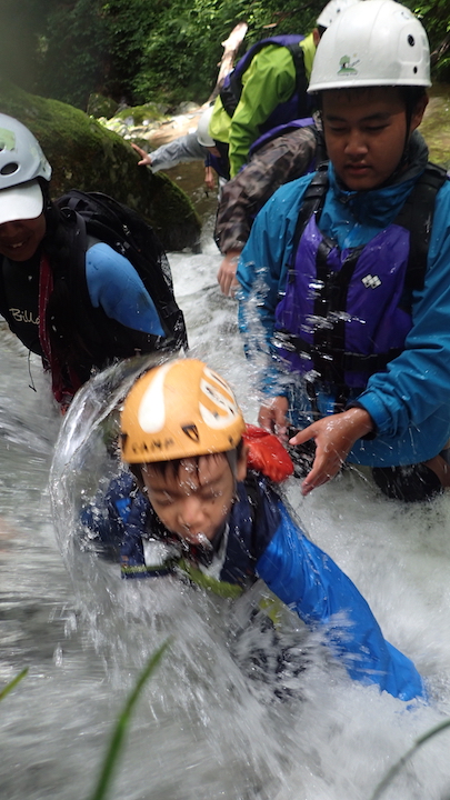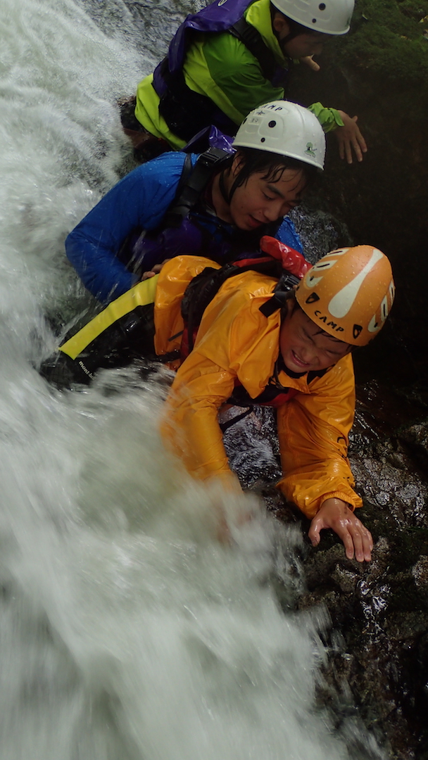 2日目は前日の荒れ模様とはうってかわって快晴の中、シャワークライミングを行いました。