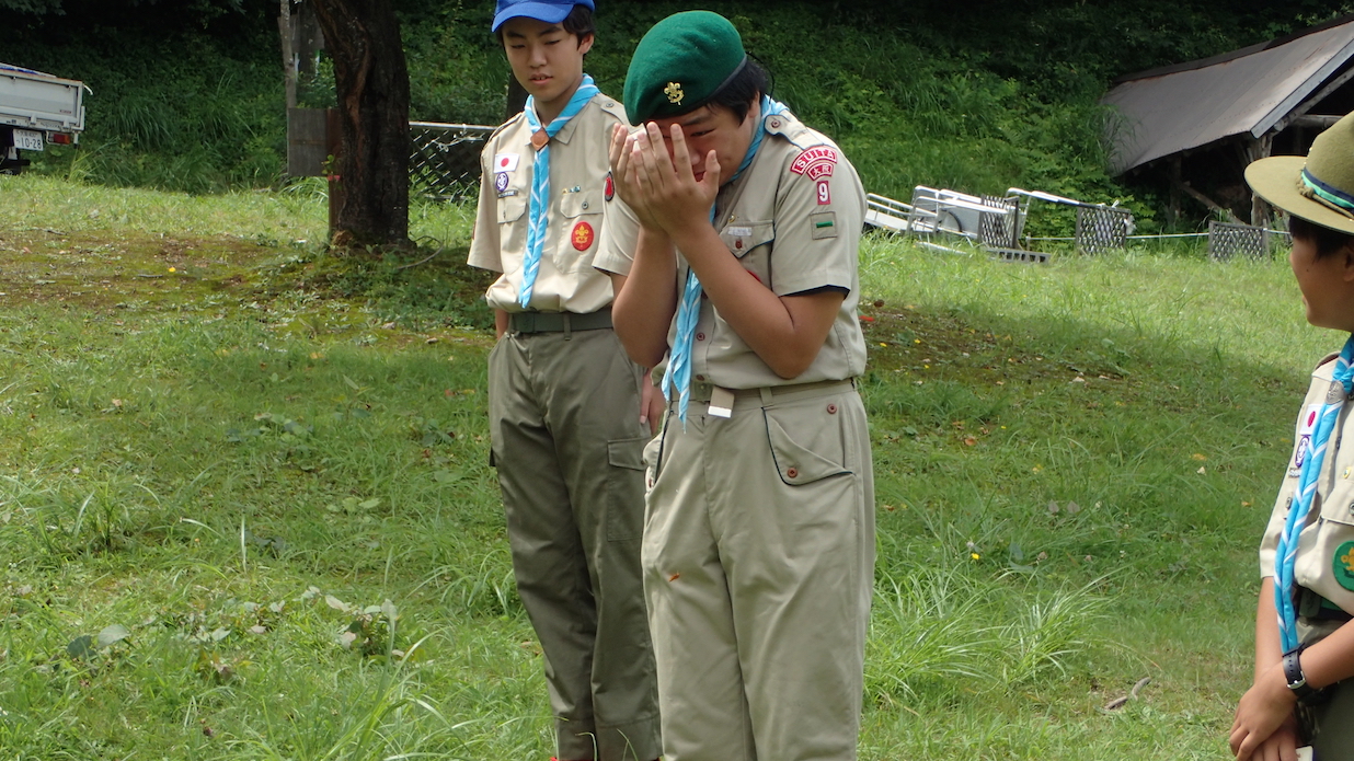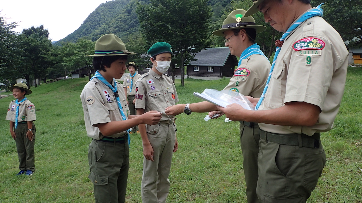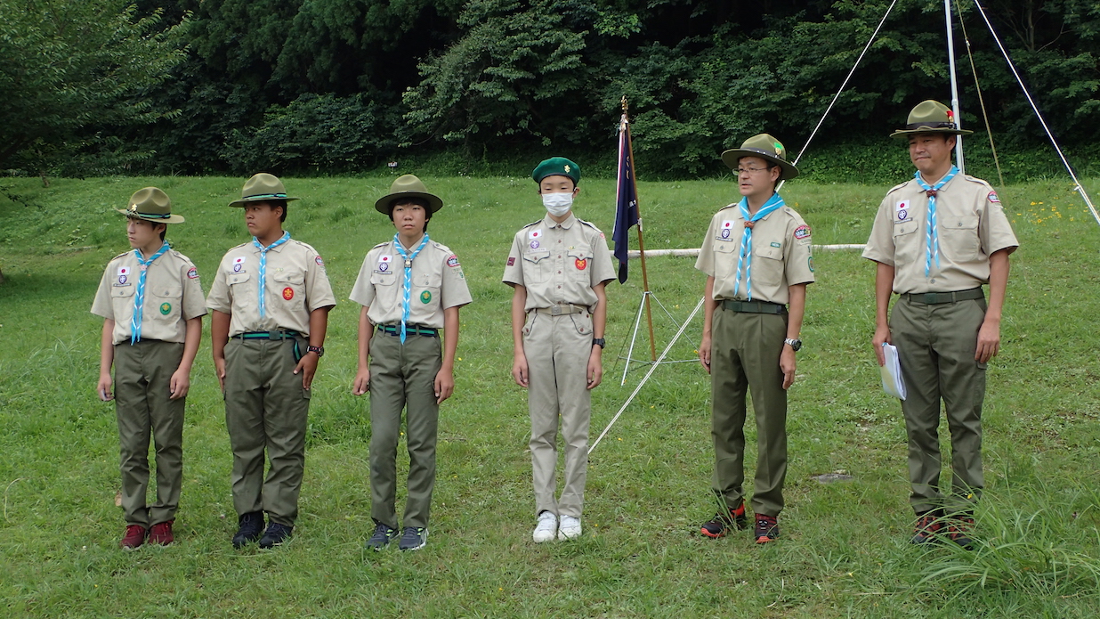 最終日のセレモニーです。キャンプで2級に進級した5名に弥栄を送りました。