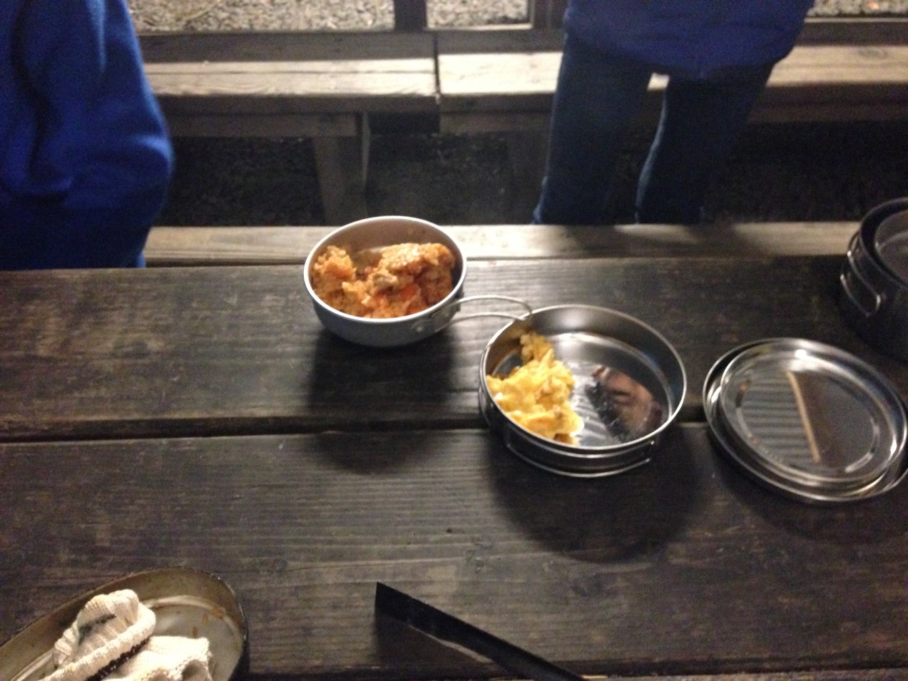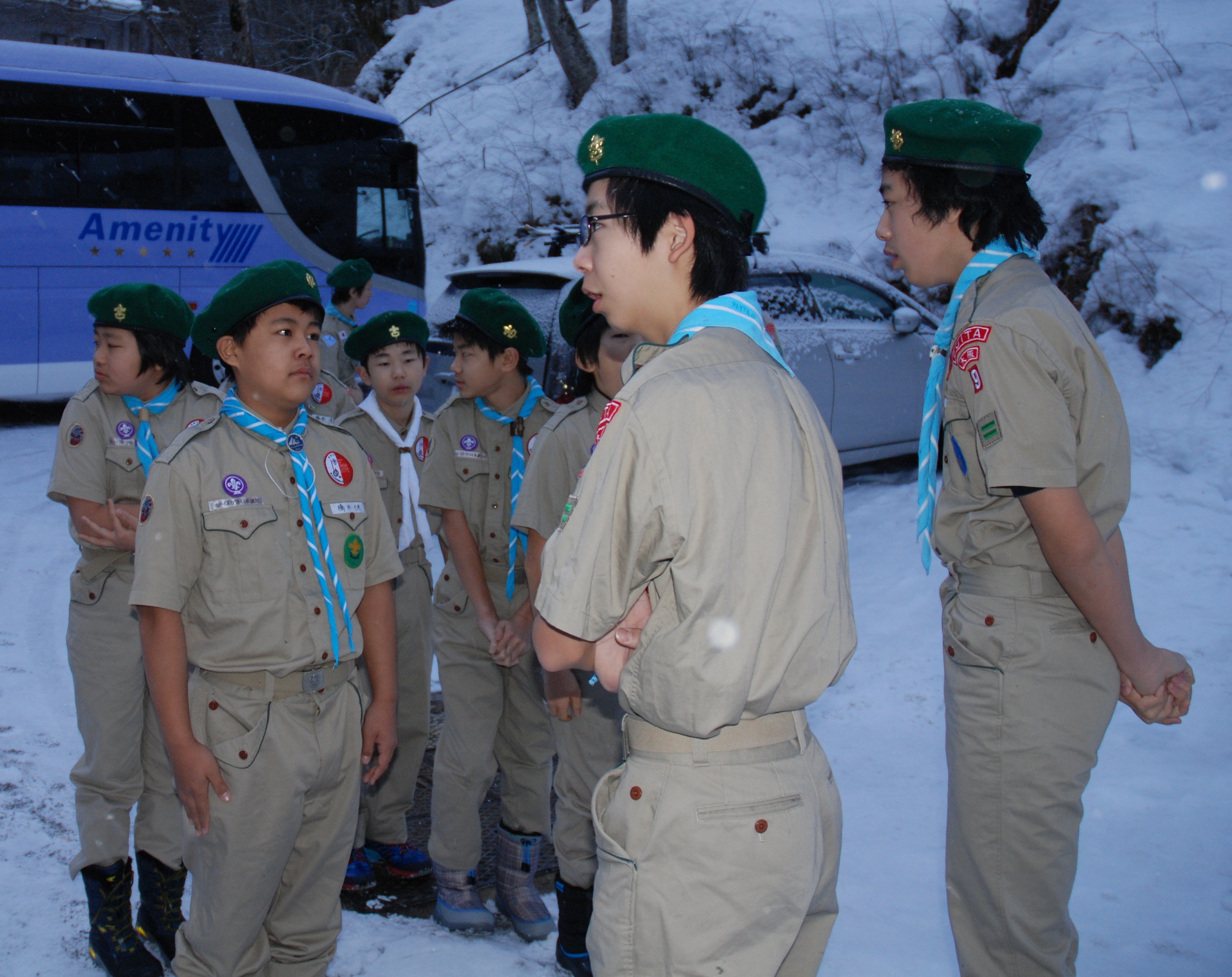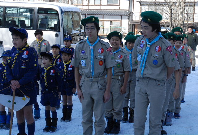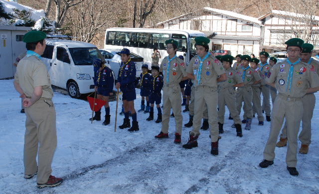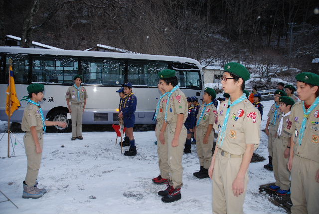 氷点下4度のなか、朝のセレモニーに備えるスカウト(11日)