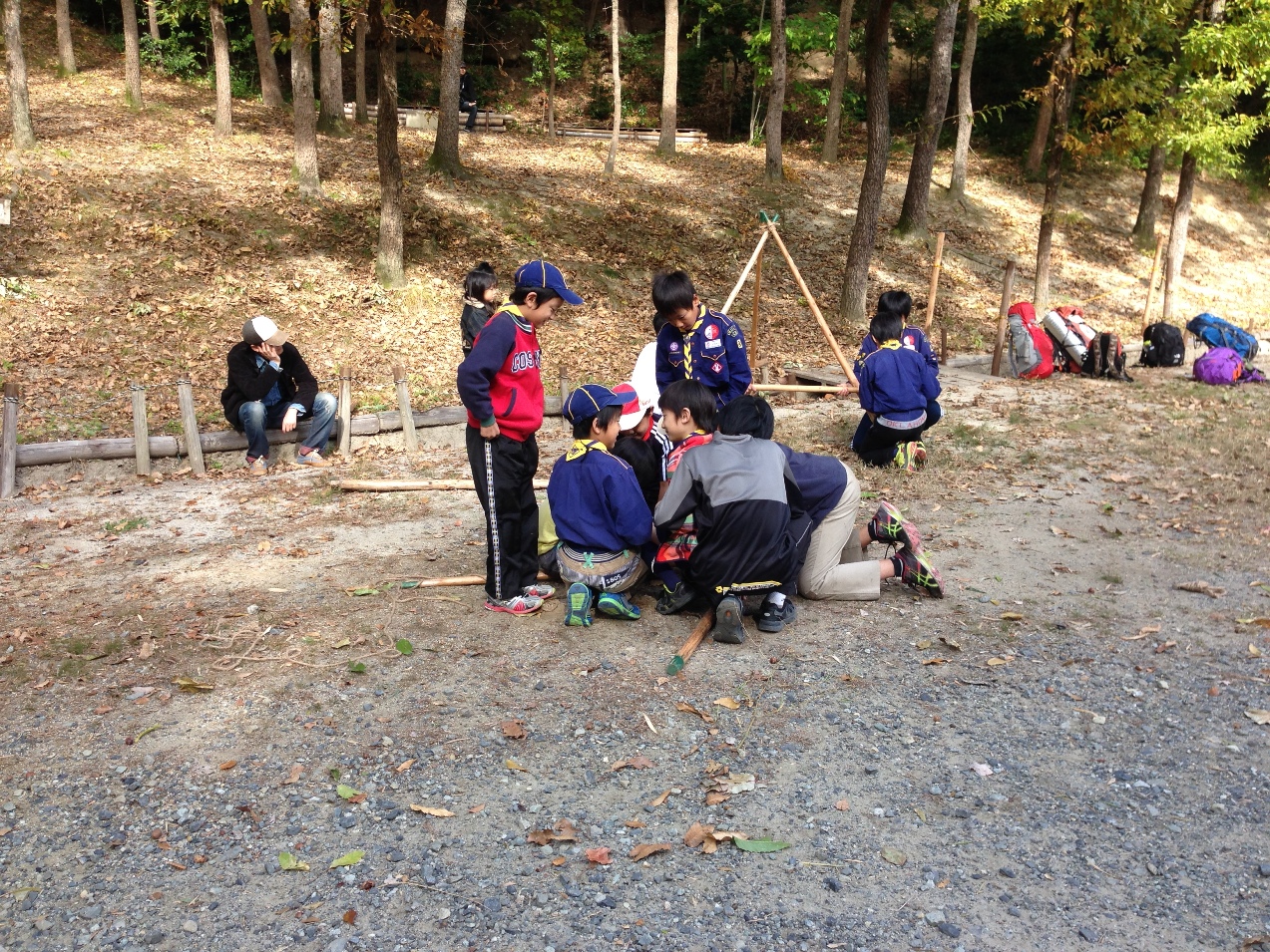 負傷者役のスカウトをシートで包み込み、搬送する訓練。まるで蓑虫?(同)