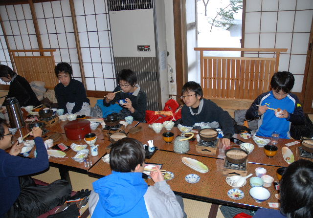 宿に帰着後、入浴。夕食の前後30分ずつ、田村団委員がスキー道具やウエアの扱い方や保存方法等を解説。また、スキー場でのエチケット、マナー、安全対策と凍傷、捻挫、骨折が起きる要因と応急手当てについて説明した。