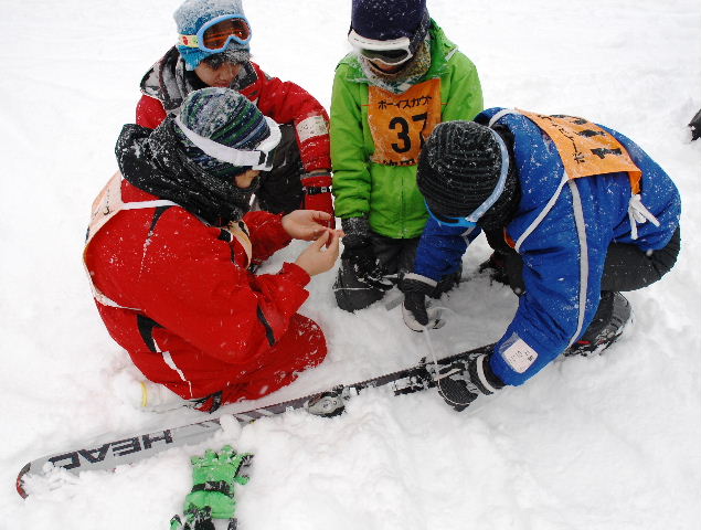 BS隊は3班に分かれ、スキー章保持者2人はCS隊の応援。残り8人は中級者と上級者に分かれ、VS隊、RS隊の4人と田村団委員の5人が指導した。初日は準備運動の後、軽く足慣らしをして終了。