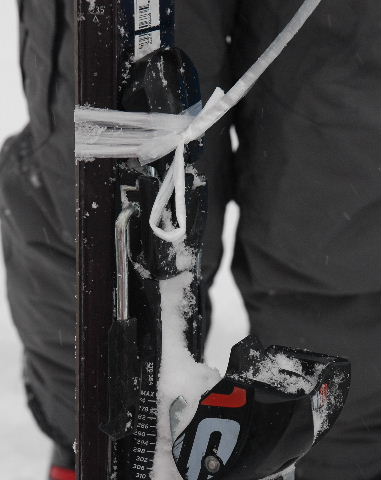 応急そり作り。スキー板のビンディングをナイロンロープで結び、押さえる(同)
