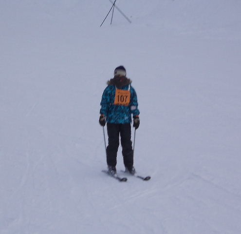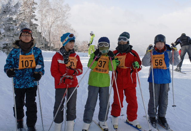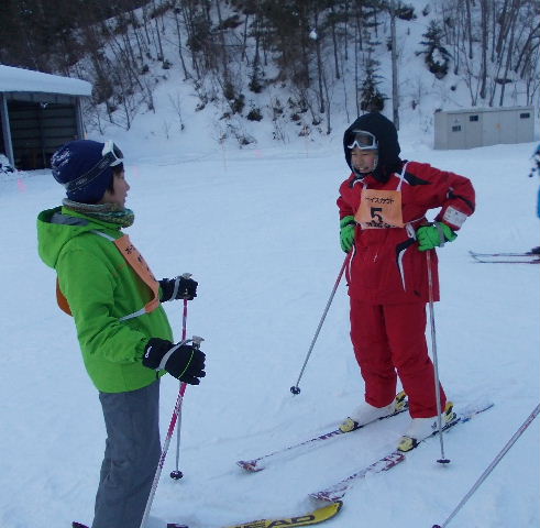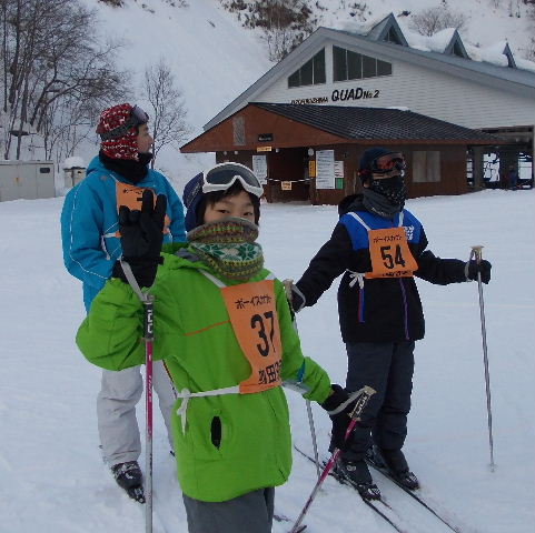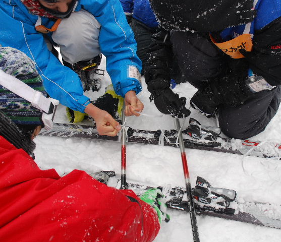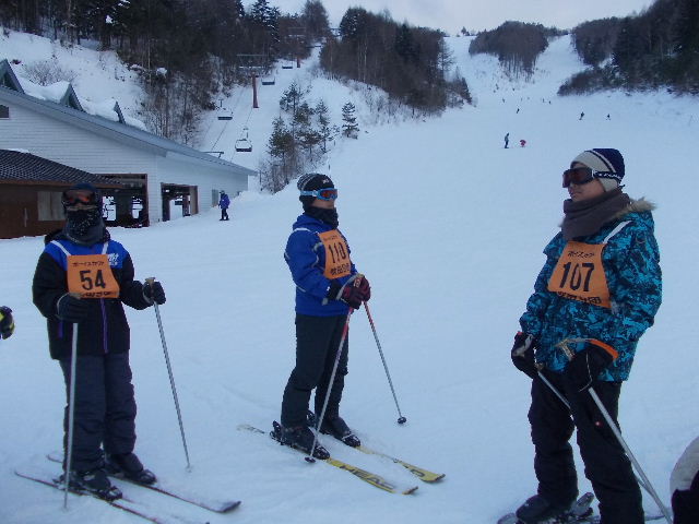 午前6時30分起床。夜半から雪が降り続き、朝のセレモニー(7時)時の気温は氷点下4.1度! 視界が悪いなか、午前中は準備運動後、2班に分かれボーゲン、シュテム・ターン、パラレル・ターンの3種目について練習を繰り返す。