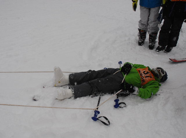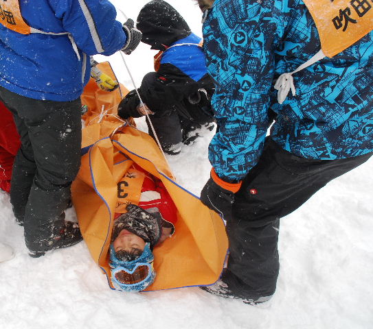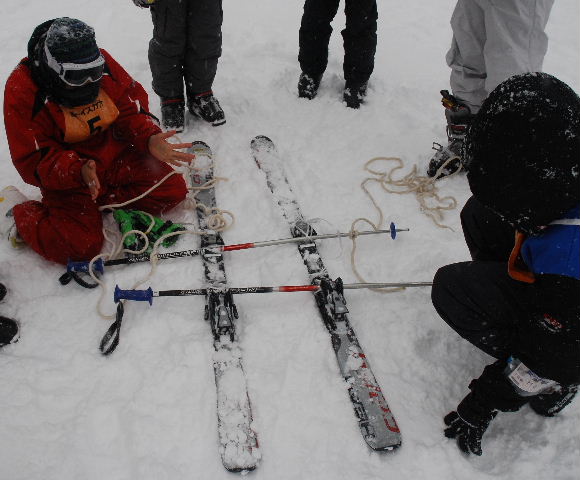 続いて、スキー板2本とストック2本を使い、応急そりを製作し、負傷者役のスカウトを乗せて搬送訓練をした。また、ブルーシートに負傷者を包んで運ぶ練習も行った。