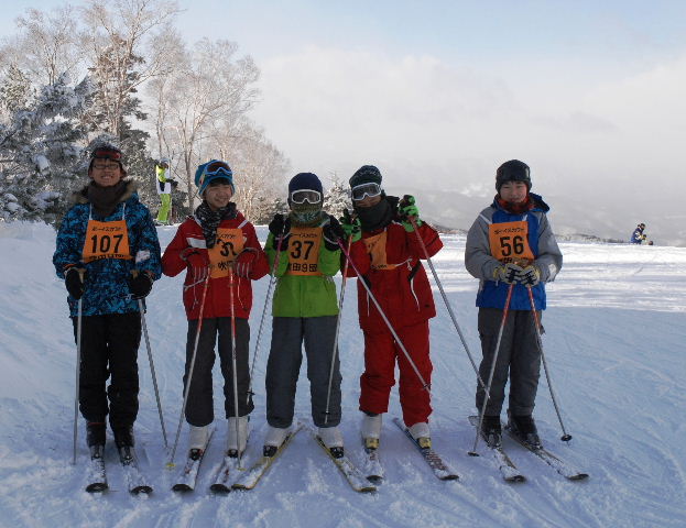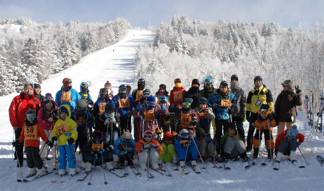 午前11時、昼食後、参加者全員で記念撮影。スキー章に挑戦する8人は4種目(プルークボーゲン20m×100m、シュテム・ターン20m×100m、パラレル・ターン40m×100m、総合滑降50m×200m)を滑走し、検定を受けた。