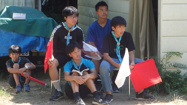 伝達ゲームで手旗を覚えます。厳しいベンチャースカウトの指導を受けてみんなだいぶ使うことができるようになりました。