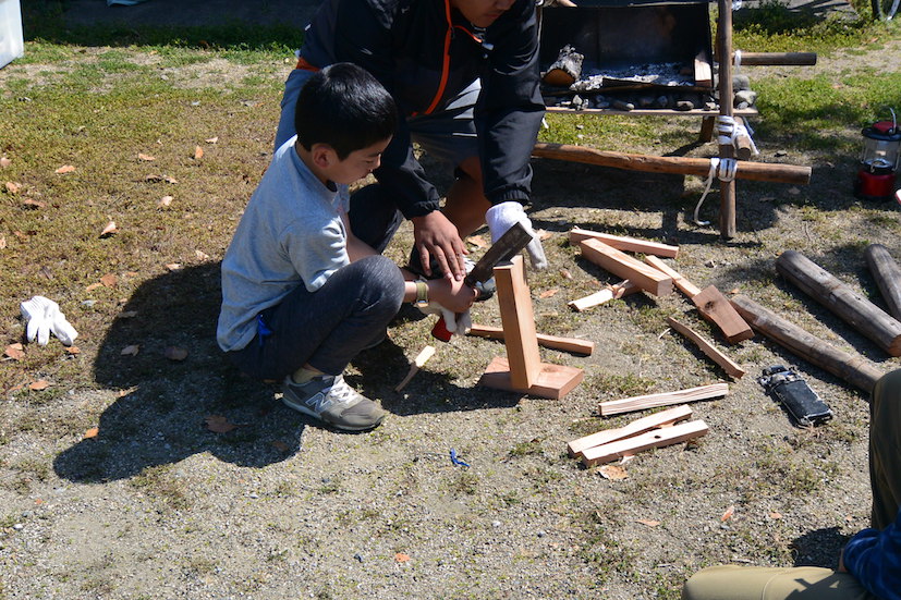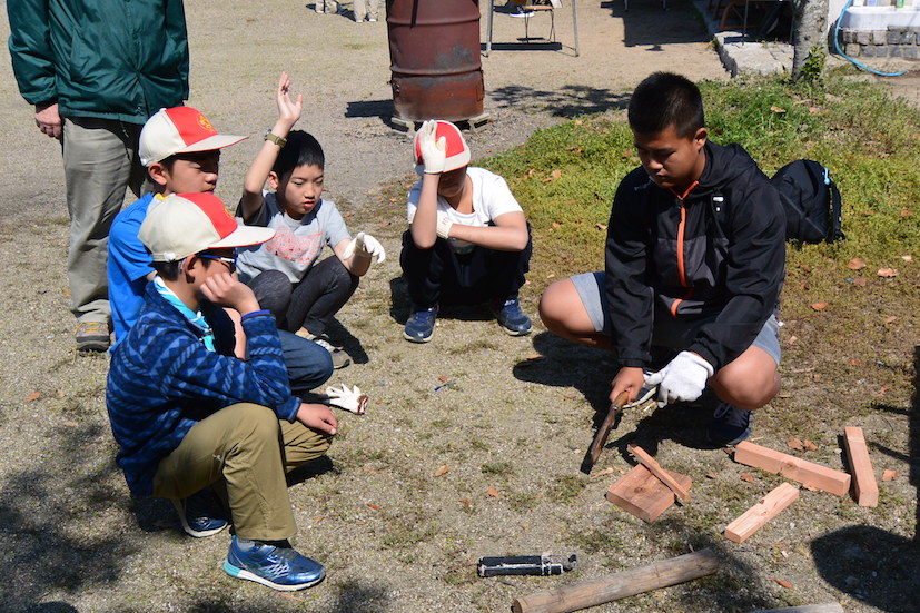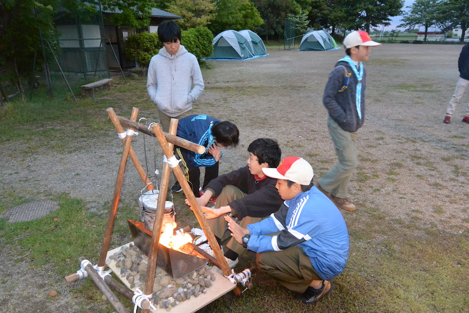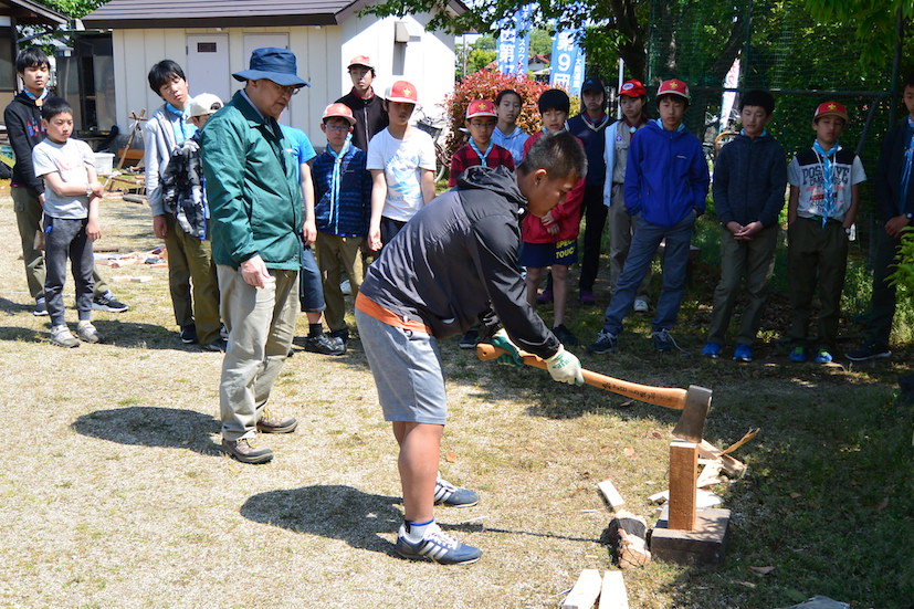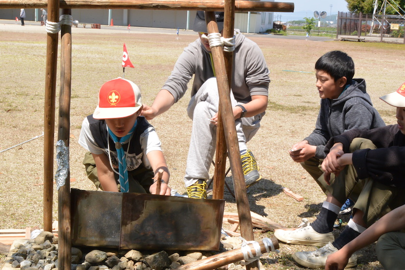 日本ジャンボリーでは薪を使った自炊を求められますので、薪の調達、火の扱いは最重要のスキルです。上級スカウトやインストラクターから入念に指導をしてもらいます。