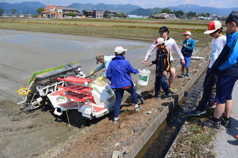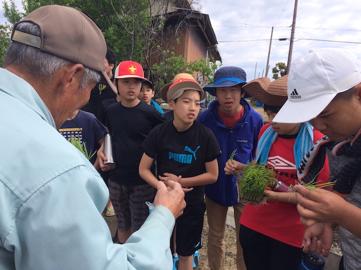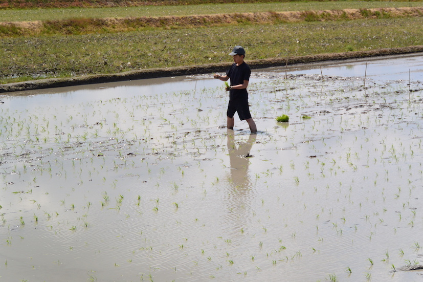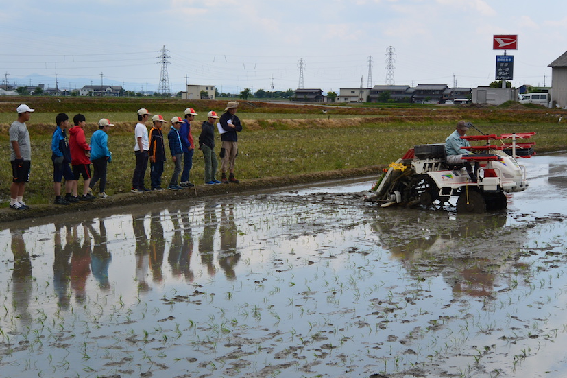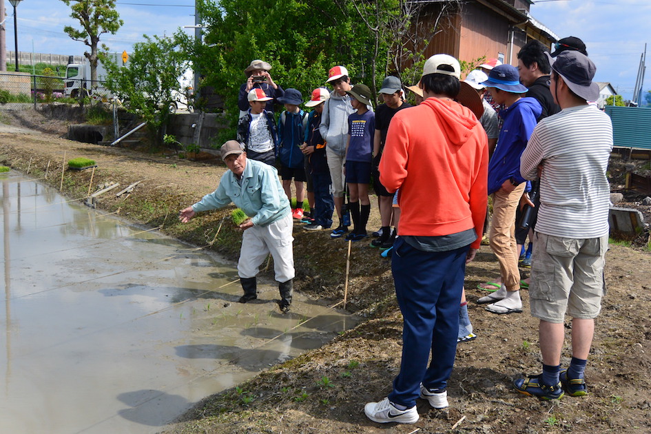 最初に田植えをする農地のオーナーに稲を植える方法の指導を受けます。